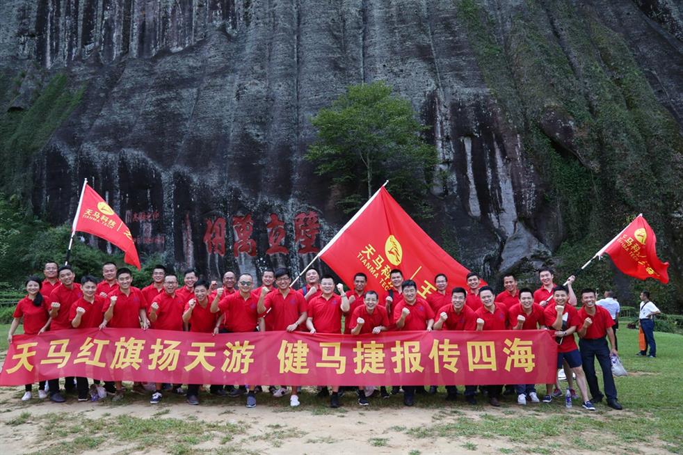 天馬科技訊 “天馬紅旗揚天游,健馬捷報傳四海。”7月19日,世界自然與文化雙世遺產勝地武夷山天游峰頂傳來天馬人的陣陣爽朗的笑聲。為豐富、活躍集團員工的業余文化生活,和著2017年半年度經營分析會擂響的戰鼓,天馬科技在經營分析會結束后,組織三十多名集團精英代表挑戰自我,開展了勇攀武夷山第一勝地天游峰活動,并在其后進行九曲漂流、觀看《印象大紅袍》山水實景演出,體驗武夷山文化,積蓄沖刺年度經營目標的力量。