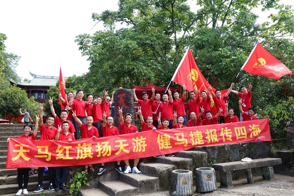 勇攀天游峰活動中,大家熱情高漲,一起穿行在綠樹掩映的山徑中,且行且欣賞如畫風景,勇攀陡峭石階,大家互相鼓勁,相互加油,攜手向著天游峰頂進發,充分展示出了天馬人敢于拼搏,“團結、務實、創新、堅韌”的企業精神。經過大家不懈的努力,當所有身著鮮艷的紅色衣服的天馬人在天游峰頂的石碑旁齊聲高喊“天馬必勝”時,激情洋溢的天馬人儼然成了武夷山頂紅紅火火的風景線。